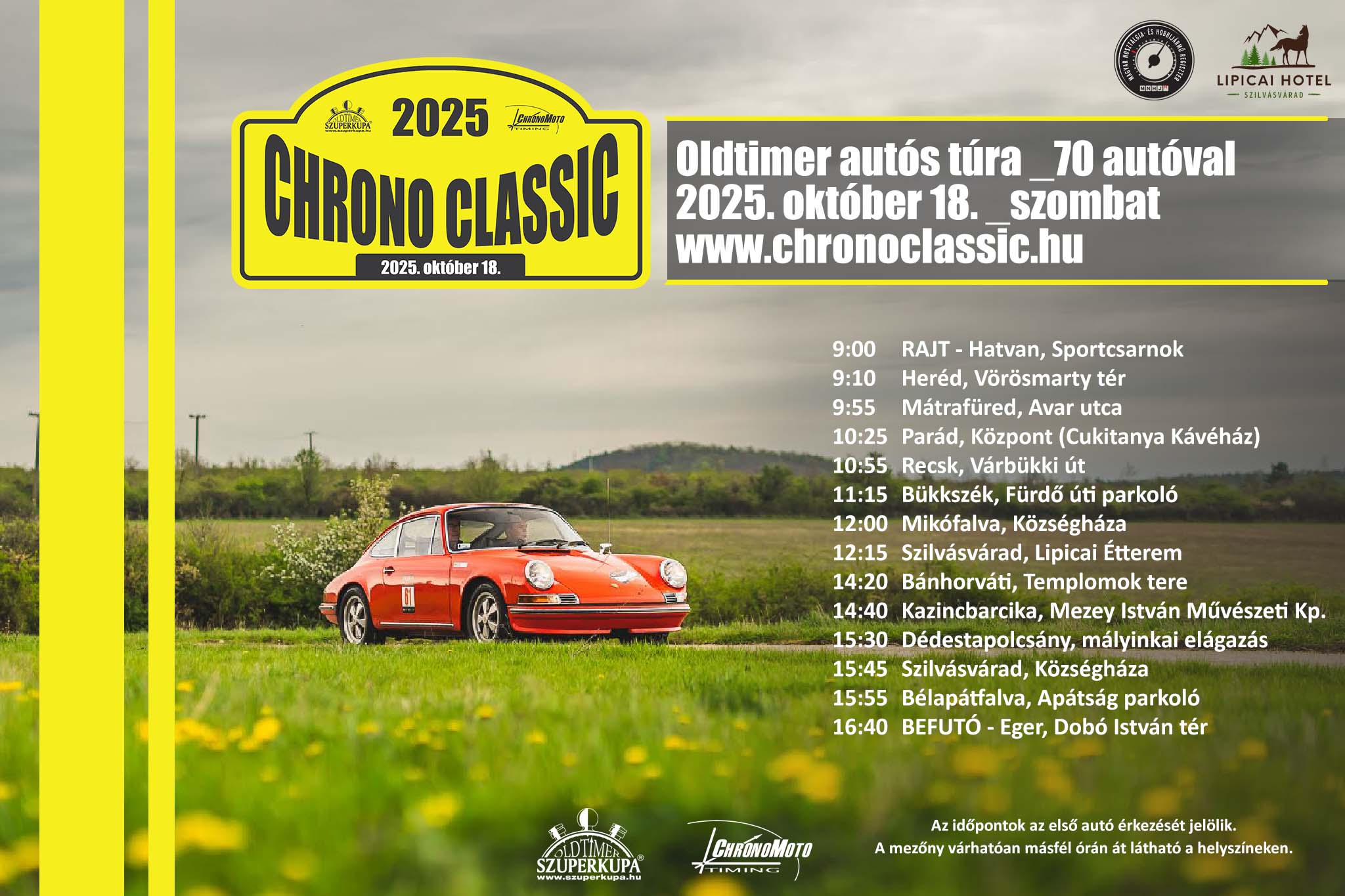 Összeállt a Chrono Classic mezőnye, mintegy 70 oldtimer és néhány különleges, limitált kiadású youngtimer vág neki szombaton az útvonalnak. Az Oldtimer Szuperkupa sorozat zárófutama idén Hatvanból indul. A csaknem 250 km-t jelölő itinert követve a résztvevők kalandos útvonalon jutnak el nagyobb és eldugott kis településeken át, a Mátra és Bükk hegységein keresztül Egerbe, a befutóra. A résztvevő párosok összehangolt együttműködése kulcsfontosságú lesz a változatos pontossági feladatok teljesítéséhez és az útközben elhelyezett pecsétek megtalálásához. A látványos helyszínekre is érdemes lesz ellátogatni. Minden érdeklődőt visszarepítünk picit az időben, mert 1953-tól egészen napjainkig mintegy 25 különböző autómárkával ismerkedhetnek meg a látványos nézői pontokra kilátogatók. Az autózás szerelmesei mind megtalálják kedvenceiket, hiszen Alfa Romeo, BMW, Chevrolet, Chrysler, Citroën, Fiat, Ford, Honda, Jaguar, Lada, Lancia, Mercedes-Benz, MG, Mini, NSU, Pontiac, Porsche, Saab, Skoda, Triumph, Volkswagen és Volvo mind áthaladnak majd az egri Dobó téren felállított célkapu alatt, ahol szakértő műsorvezető mutatja be az autókat. | |||||||||||||||